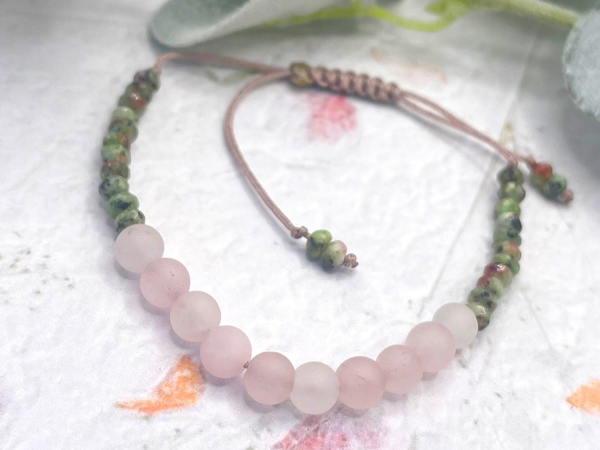 Handcrafted with 10 frosted 6mm Rose Quartz stones and accented with faceted Red Green Jasper beads, it rests on a soft dusky pink polyester cord with a secure sliding knot for a perfect adjustable fit.